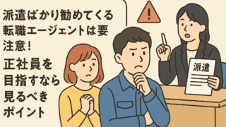 転職エージェント・求人サービス 派遣ばかり勧めてくる転職エージェントは要注意!正社員を目指すなら見るべきポイント 「正社員を希望しているのに、無期雇用派遣ばかり勧められる」「面談でこちらの希望を否定され続ける」──そんな声は20代前半の製造業・第二新卒層で特に多く聞きます。本記事では、“要注意エージェント”の見分け方と、正社員を目指すための具体的ステッ... 2025.10.05 転職エージェント・求人サービス