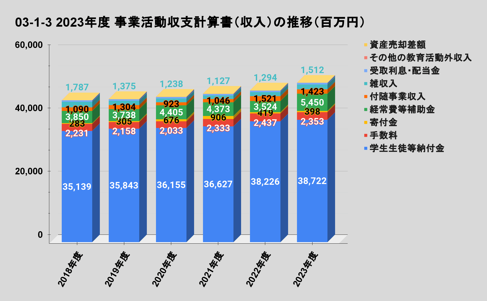 | 教育活動収入計 | 44,378,978,236 | 44,722,029,584 | 45,430,116,803 | 46,412,452,152 | 47,420,213,166 | 49,857,515,340 |