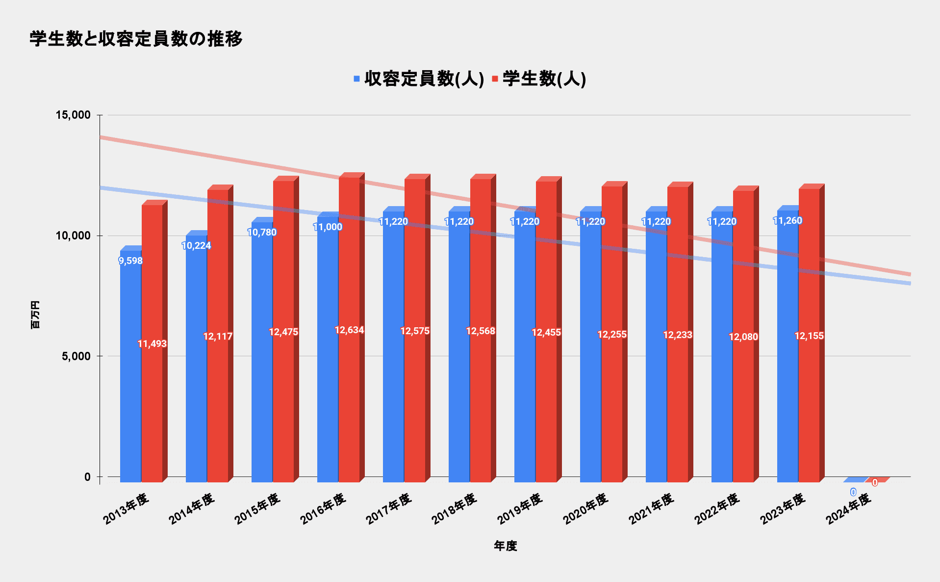 | 収容定員数(人) | 9,598 | 10,224 | 10,780 | 11,000 | 11,220 | 11,220 | 11,220 | 11,220 | 11,220 | 11,220 | 11,260 |