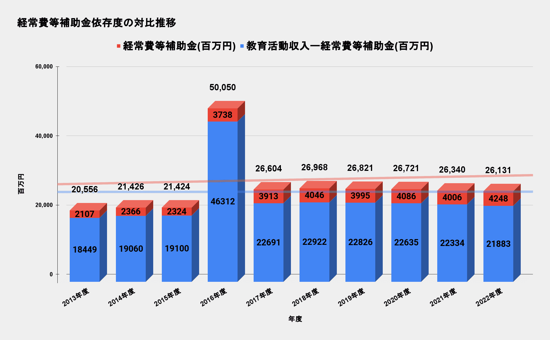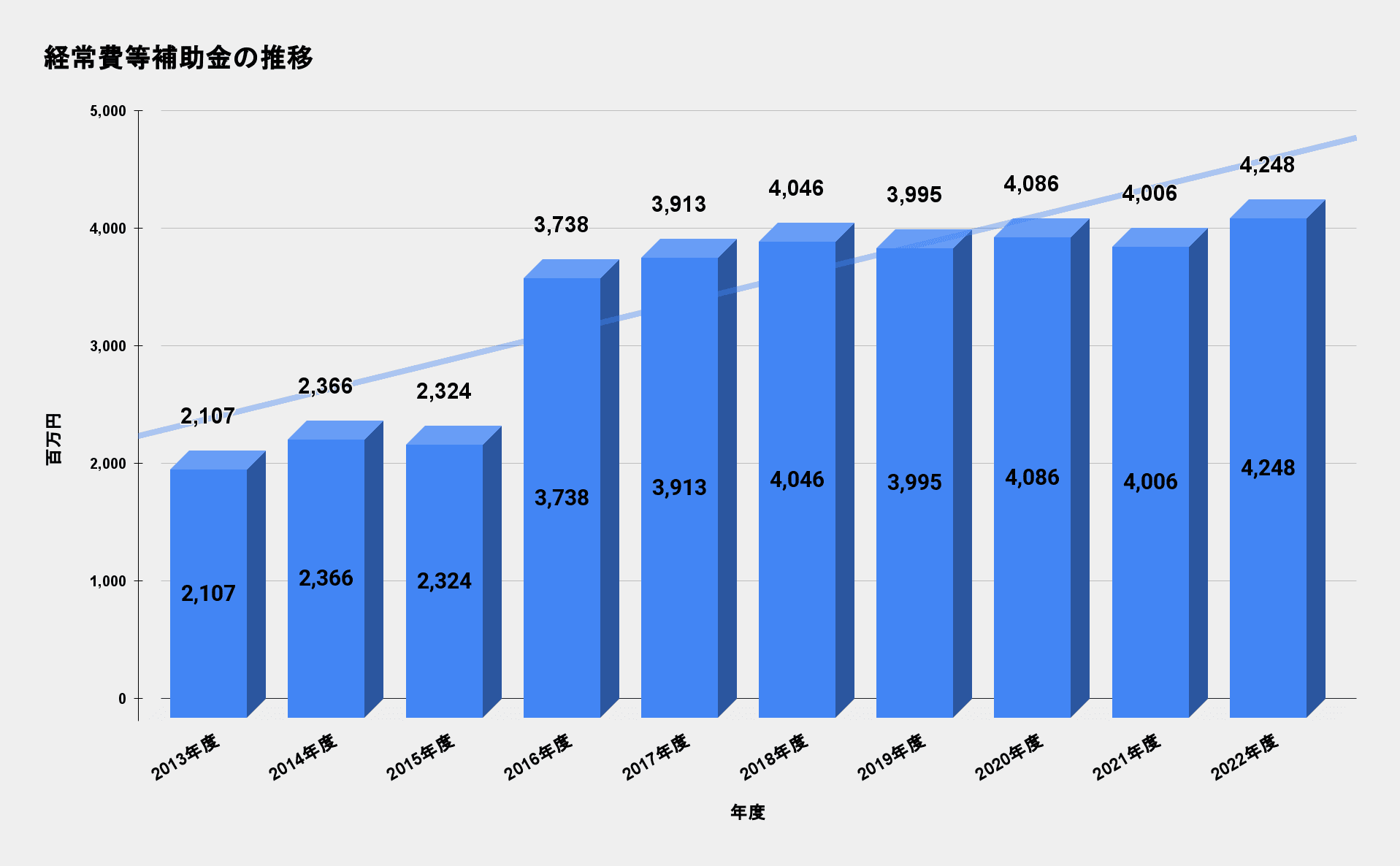 | 経常費等補助金(百万円) | 2,107 | 2,366 | 2,324 | 3,738 | 3,913 | 4,046 | 3,995 | 4,086 | 4,006 | 4,248 |