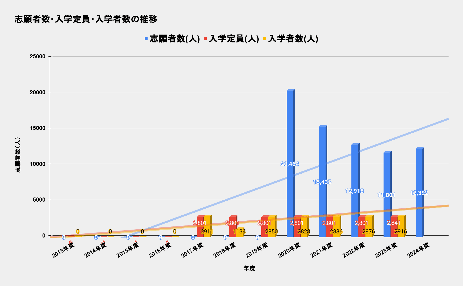 | 志願者数(人) | 20,464 | 15,435 | 12,918 | 11,801 | 12,392 |