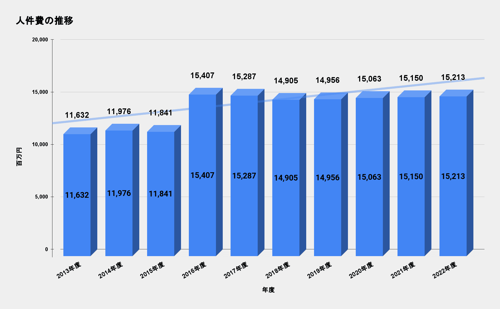 | 人件費(百万円) | 11,632 | 11,976 | 11,841 | 15,407 | 15,287 | 14,905 | 14,956 | 15,063 | 15,150 | 15,213 |