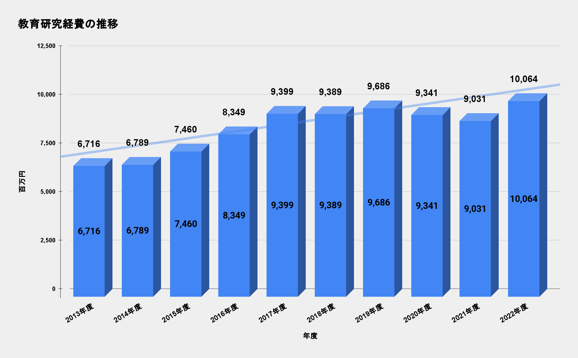 | 教育研究費(百万円) | 6,716 | 6,789 | 7,460 | 8,349 | 9,399 | 9,389 | 9,686 | 9,341 | 9,031 | 10,064 |