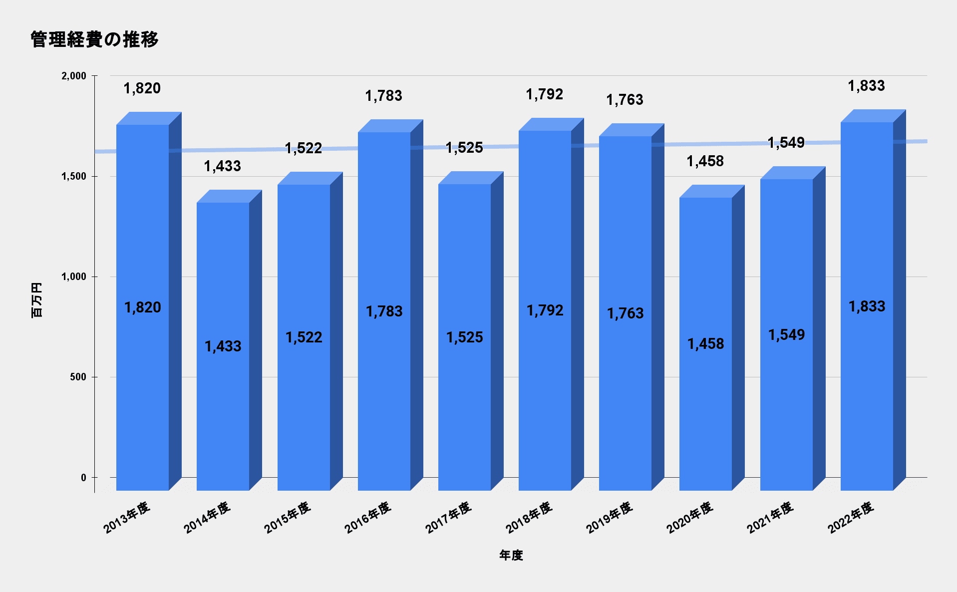 | 管理経費(百万円) | 1,820 | 1,433 | 1,522 | 1,783 | 1,525 | 1,792 | 1,763 | 1,458 | 1,549 | 1,833 |