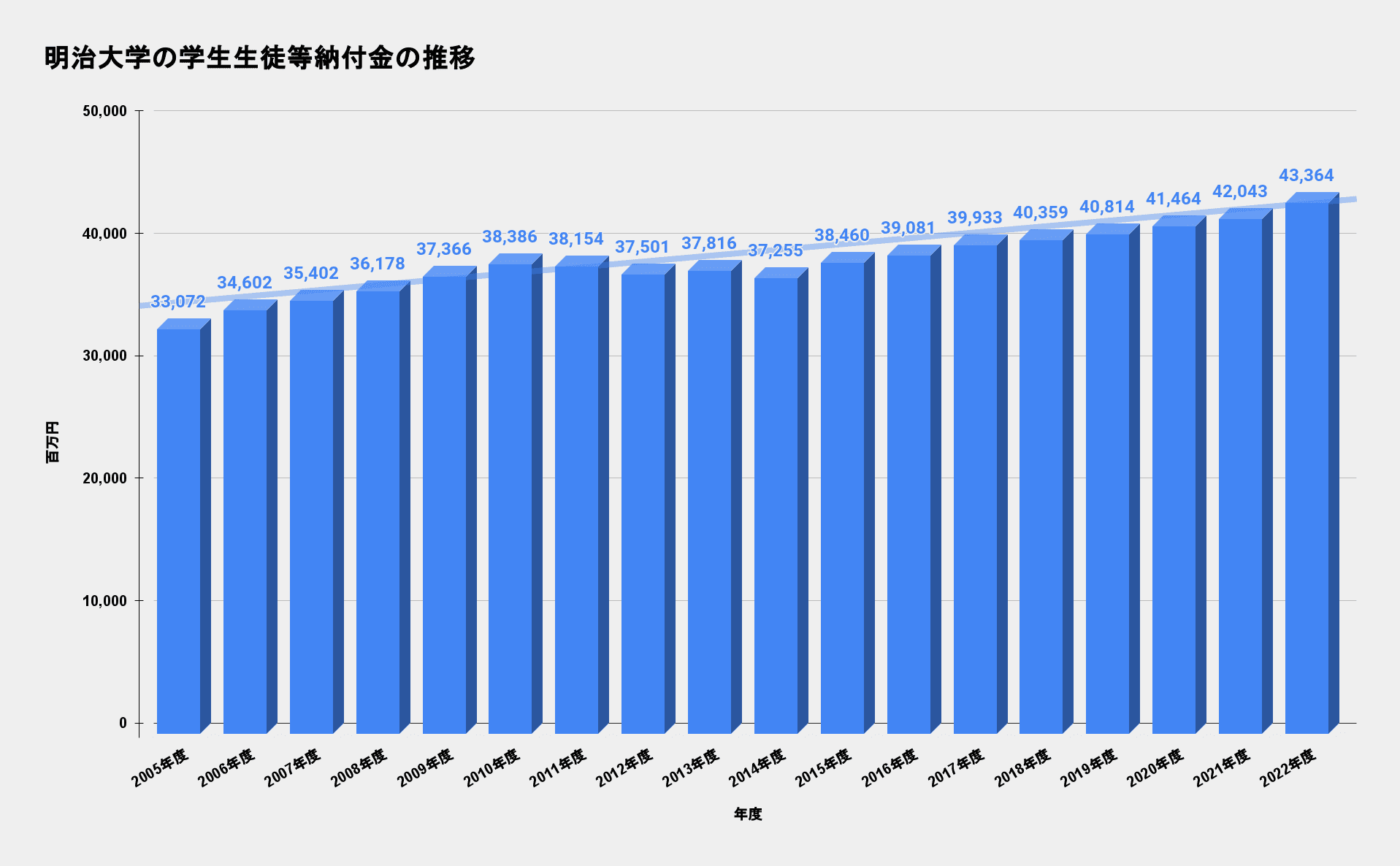これは2005年度からの明治大学の学生生徒等納付金の推移グラフです。