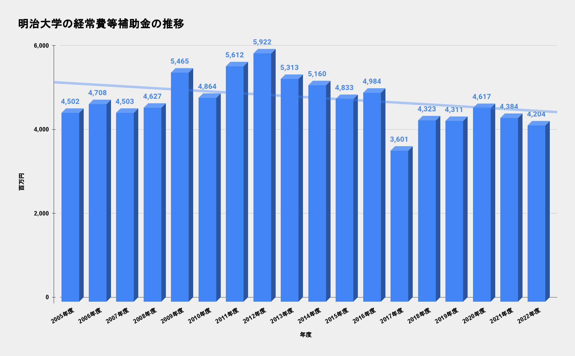 経常費等補助金(百万円)4,5024,7084,5034,6275,4654,8645,6125,9225,3135,1604,8334,9843,6014,3234,3114,6174,3844,204