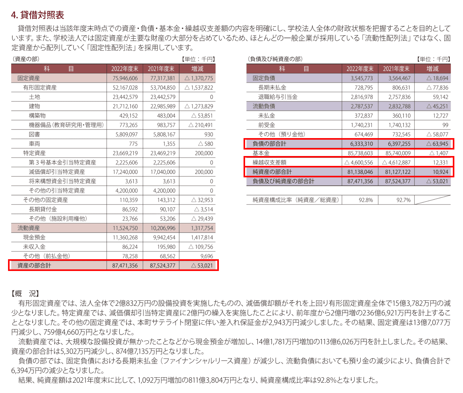 - 総資産・総負債・純資産(基本金)・繰越収支差額の状況は?