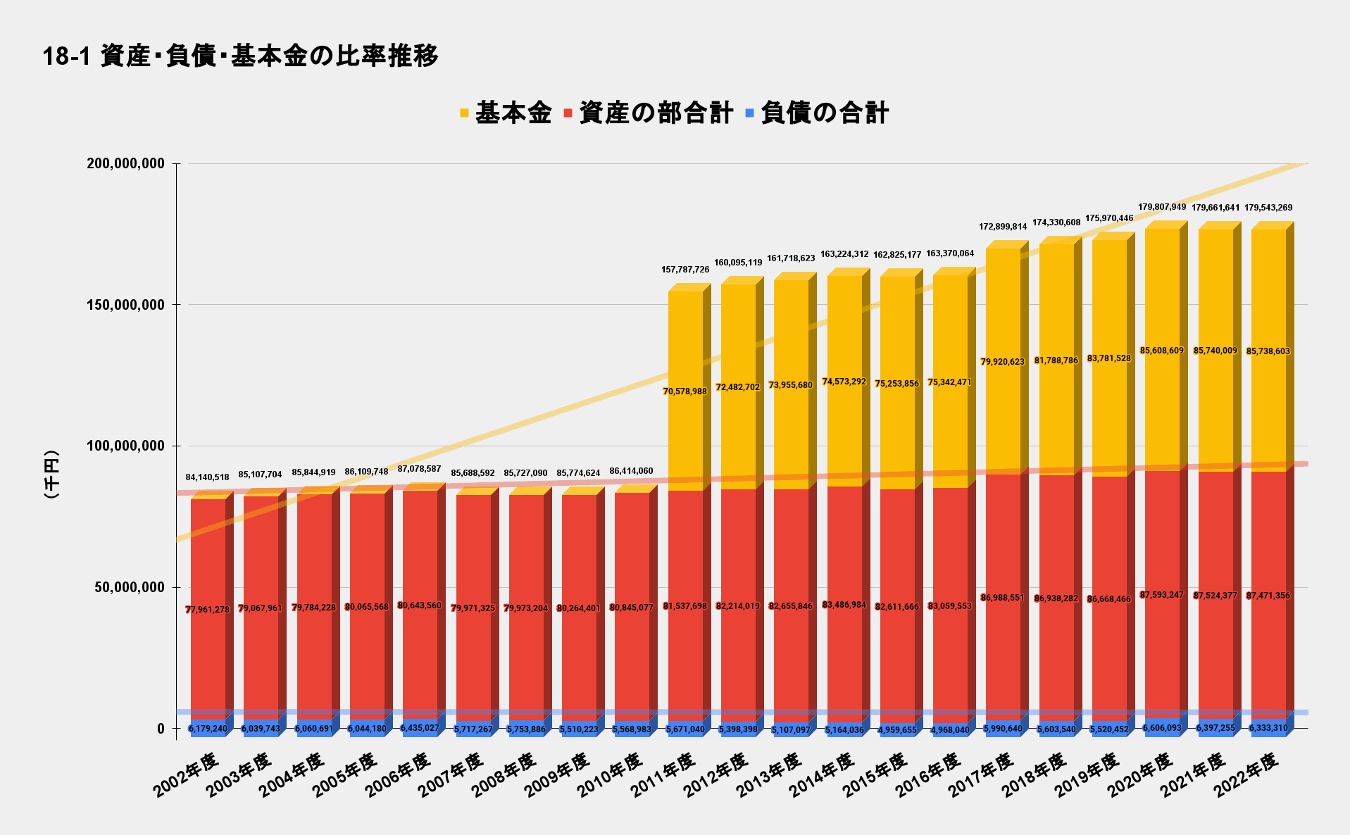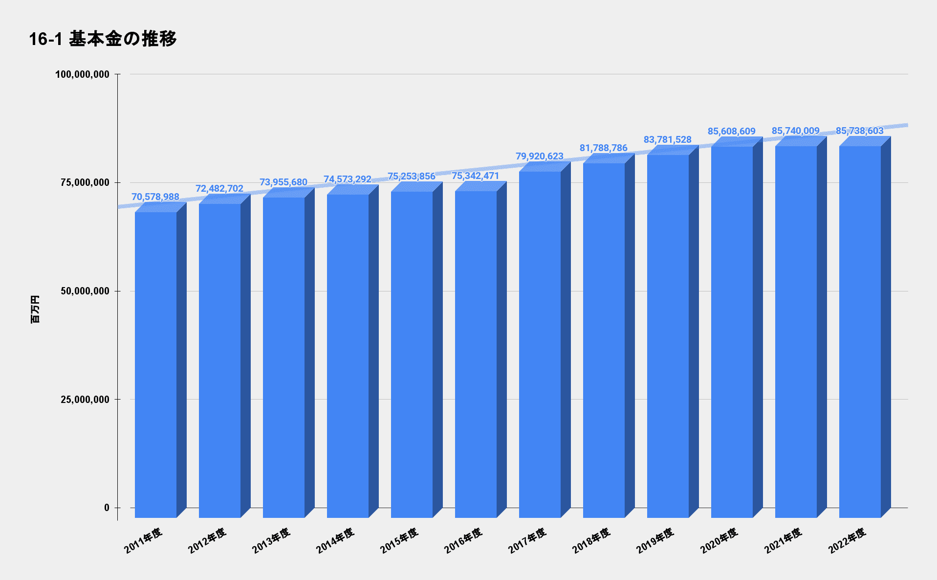 | 基本金 | 70,578,988 | 72,482,702 | 73,955,680 | 74,573,292 | 75,253,856 | 75,342,471 | 79,920,623 | 81,788,786 | 83,781,528 | 85,608,609 | 85,740,009 | 85,738,603 |