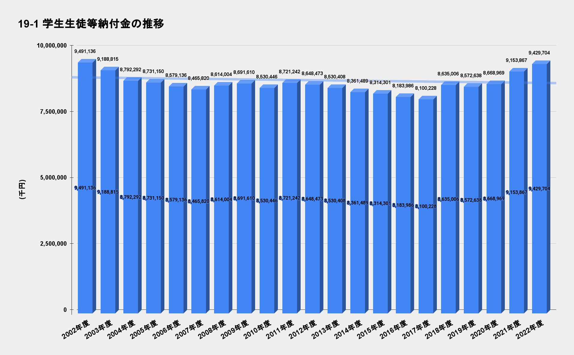 | 学生生徒等納付金(千円) | 9,491,136 | 9,188,815 | 8,792,292 | 8,731,150 | 8,579,136 | 8,465,820 | 8,614,004 | 8,691,610 | 8,530,446 | 8,721,242 | 8,648,473 | 8,530,408 | 8,361,489 | 8,314,301 | 8,183,986 | 8,100,228 | 8,635,006 | 8,572,638 | 8,668,969 | 9,153,867 | 9,429,704 |