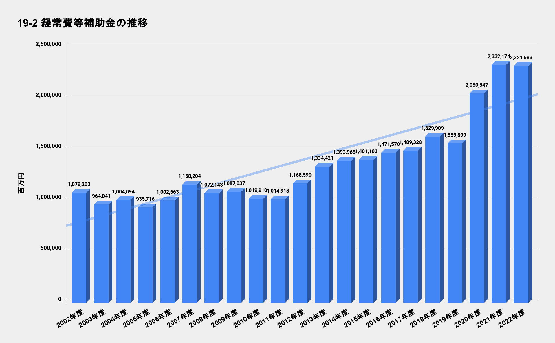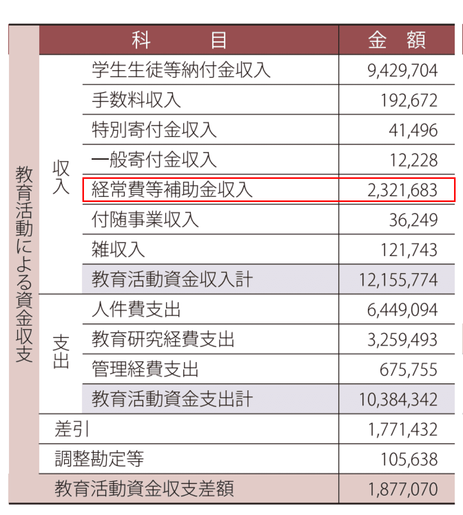 | 経常費等補助金 | 1,079,203 | 964,041 | 1,004,094 | 935,716 | 1,002,663 | 1,158,204 | 1,072,143 | 1,087,037 | 1,019,910 | 1,014,918 | 1,168,590 | 1,334,421 | 1,393,965 | 1,401,103 | 1,471,570 | 1,489,328 | 1,629,909 | 1,559,899 | 2,050,547 | 2,332,174 | 2,321,683 |