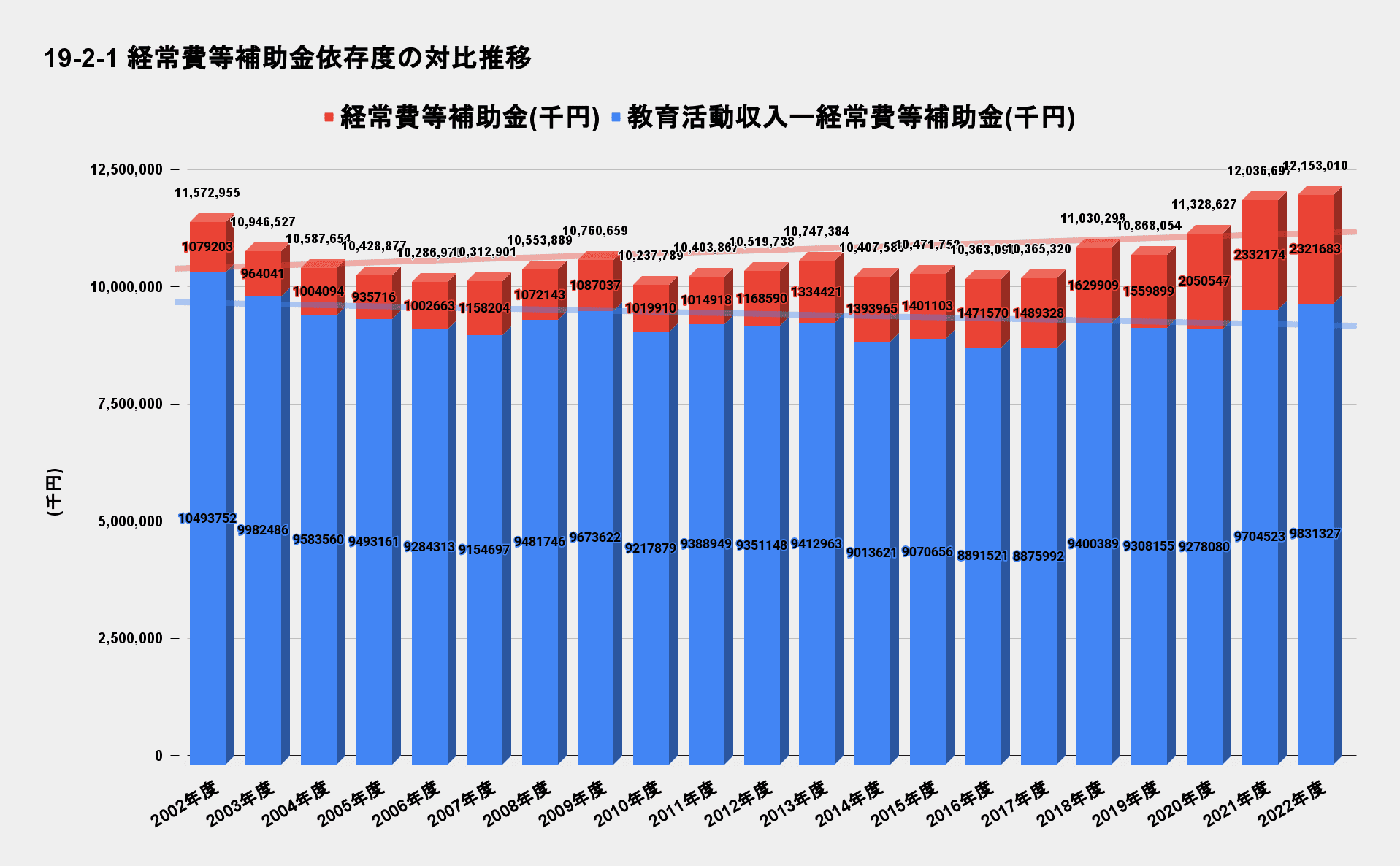 | 経常費等補助金(千円) | 1,079,203 | 964,041 | 1,004,094 | 935,716 | 1,002,663 | 1,158,204 | 1,072,143 | 1,087,037 | 1,019,910 | 1,014,918 | 1,168,590 | 1,334,421 | 1,393,965 | 1,401,103 | 1,471,570 | 1,489,328 | 1,629,909 | 1,559,899 | 2,050,547 | 2,332,174 | 2,321,683 |