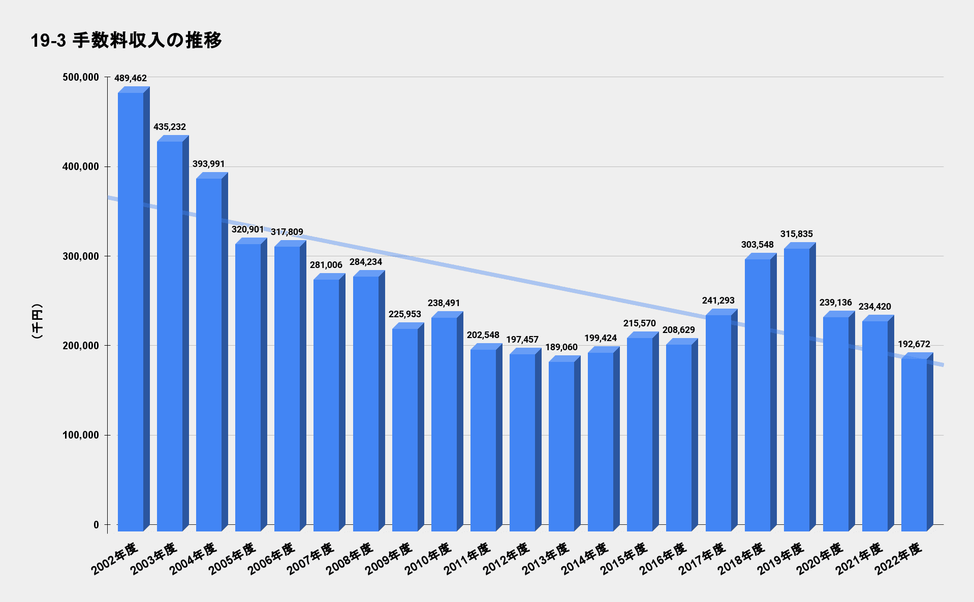| 手数料(千円) | 489,462 | 435,232 | 393,991 | 320,901 | 317,809 | 281,006 | 284,234 | 225,953 | 238,491 | 202,548 | 197,457 | 189,060 | 199,424 | 215,570 | 208,629 | 241,293 | 303,548 | 315,835 | 239,136 | 234,420 | 192,672 |