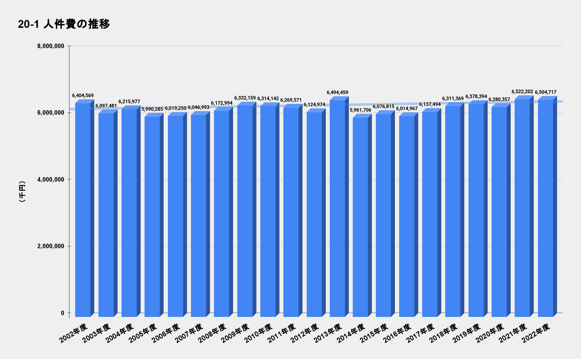 | 人件費(千円) | 6,404,569 | 6,097,481 | 6,215,977 | 5,990,285 | 6,019,250 | 6,046,993 | 6,172,994 | 6,332,159 | 6,314,142 | 6,269,571 | 6,124,974 | 6,494,459 | 5,961,706 | 6,076,815 | 6,014,967 | 6,137,494 | 6,311,369 | 6,378,394 | 6,280,357 | 6,522,202 | 6,504,717 |