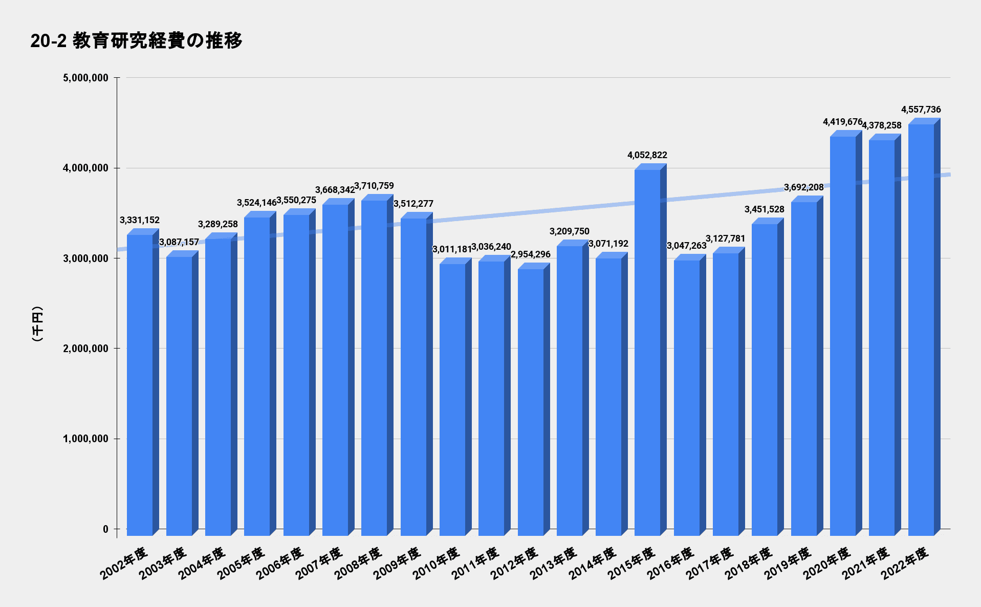 | 教育研究経費(千円) | 3,331,152 | 3,087,157 | 3,289,258 | 3,524,146 | 3,550,275 | 3,668,342 | 3,710,759 | 3,512,277 | 3,011,181 | 3,036,240 | 2,954,296 | 3,209,750 | 3,071,192 | 4,052,822 | 3,047,263 | 3,127,781 | 3,451,528 | 3,692,208 | 4,419,676 | 4,378,258 | 4,557,736 |