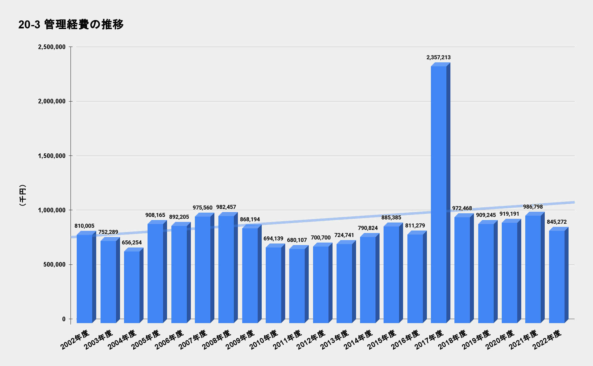 | 管理経費(千円) | 810,005 | 752,289 | 656,254 | 908,165 | 892,205 | 975,560 | 982,457 | 868,194 | 694,139 | 680,107 | 700,700 | 724,741 | 790,824 | 885,385 | 811,279 | 2,357,213 | 972,468 | 909,245 | 919,191 | 986,798 | 845,272 |