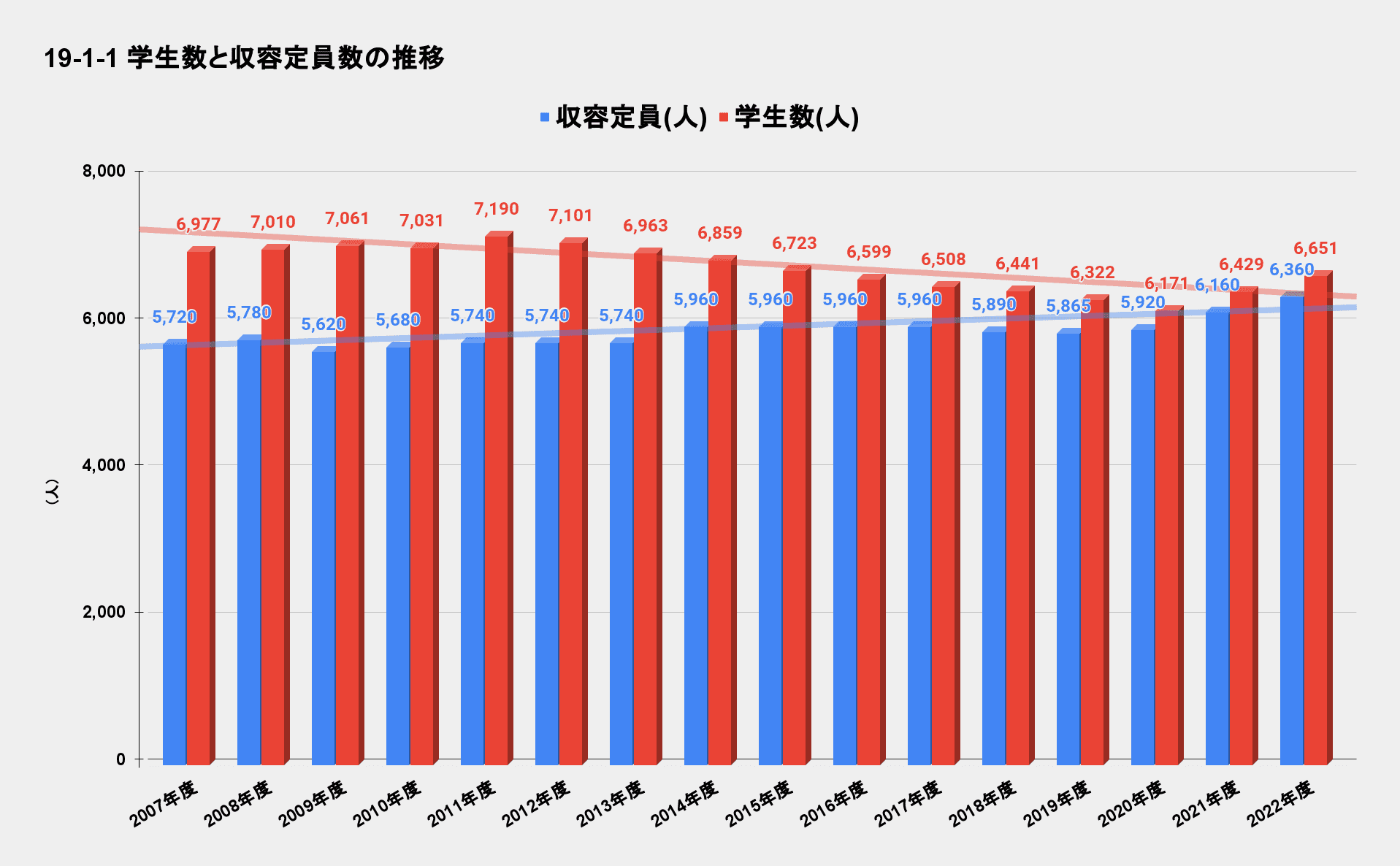 | 収容定員(人) | 5,720 | 5,780 | 5,620 | 5,680 | 5,740 | 5,740 | 5,740 | 5,960 | 5,960 | 5,960 | 5,960 | 5,890 | 5,865 | 5,920 | 6,160 | 6,360 |