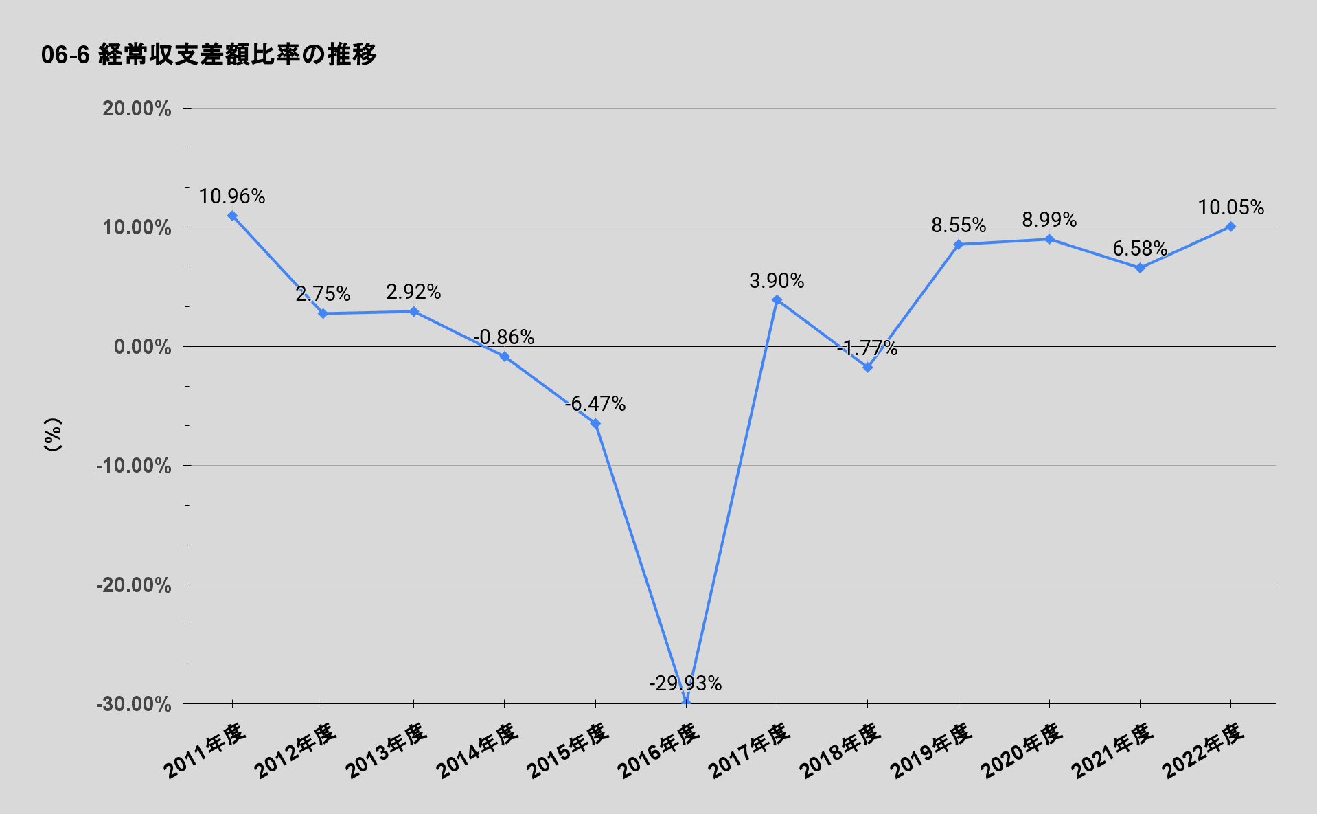 繰越収支差額の「総負債および純資産の合計額」に占める構成割合である。 繰越収支差額とは、過去の会計年度の事業活動収入超過額又は支出超過額の累計であり、一般的には支出超過 (累積赤字) であるよりも収入超過 (累積黒字) であることが 理想的である。 しかし、単年度の事業活動収支を分析する場合と同様に、事業活動収支差額は各年度の基本金への組入れ状況によって左右される場合もあるため、この比率のみで分析した 場合、一面的な評価となるおそれがある。 この比率で評価を行う場合は基本金の内訳とその構成比率と併せて検討する必要があ
