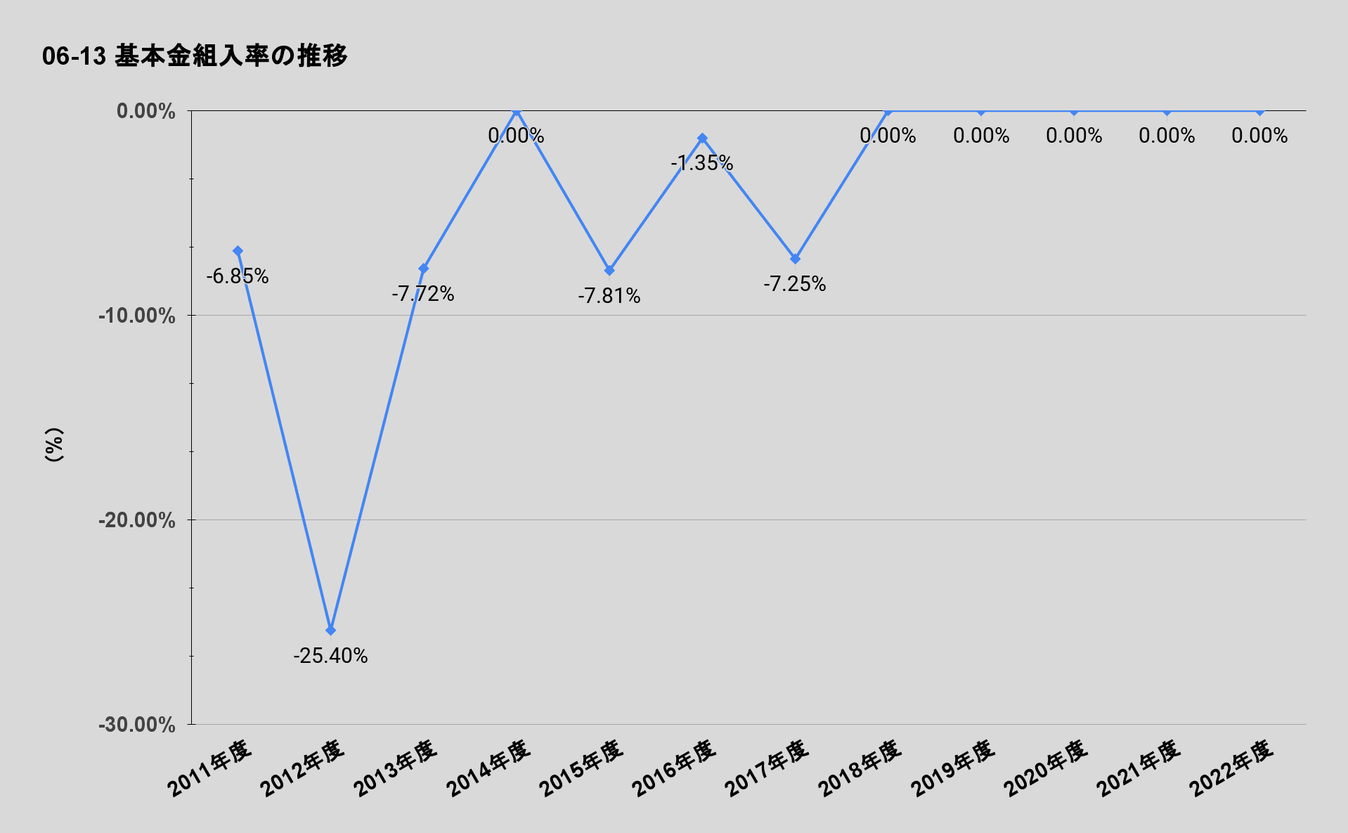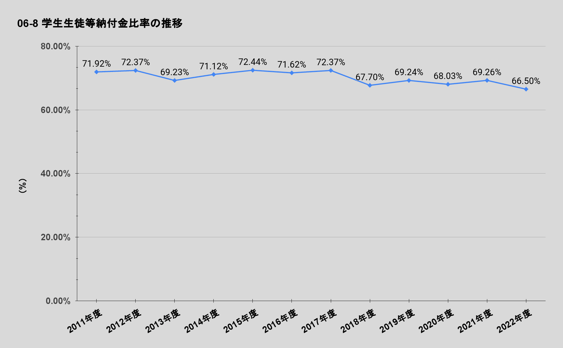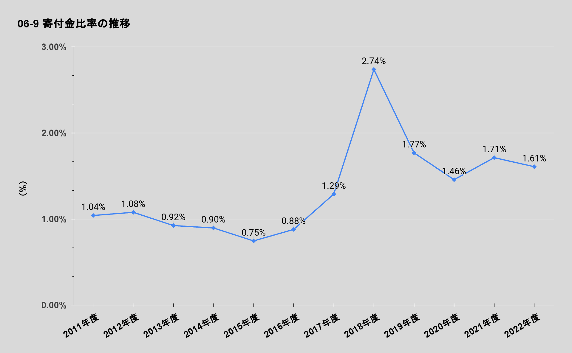 寄付金の事業活動収入に占める割合である。 寄付金は私立学校にとって重要な収入源であり、 一定水準の寄付金収入を継続して確保することが経営の安定のためには好ましいことである。 しかし、寄付金は予定された収入ではないため年度による増減幅が大きくなる。周年事業の寄付金募集を行っている場合、事業の終了後に寄付金収入が大きく落ち込む例が 典型的である。 今後の学校経営においては、学内の寄付金募集体制を充実させ、一定水準の寄付金の安定的な確保に努めることの重要性が高まっている。