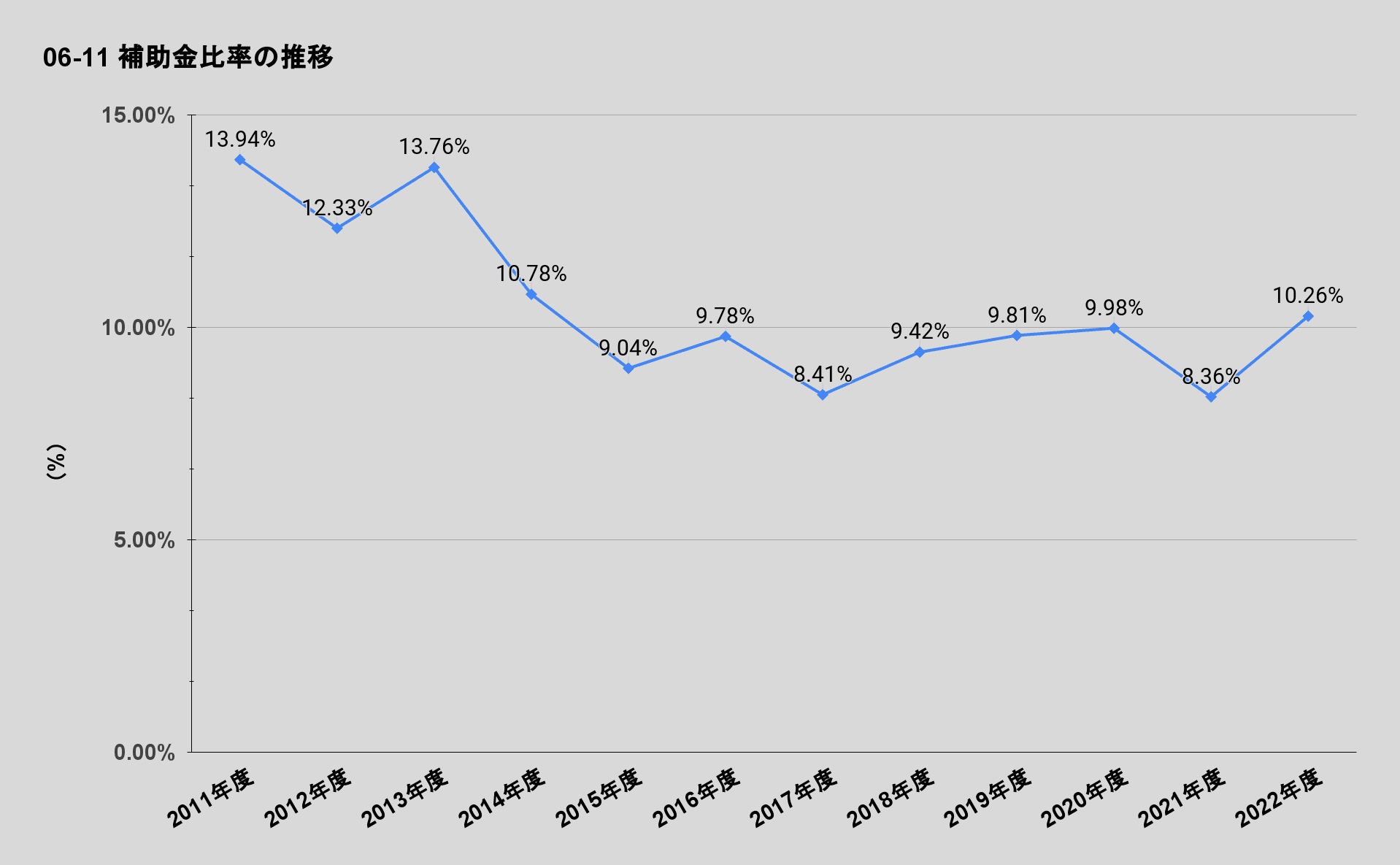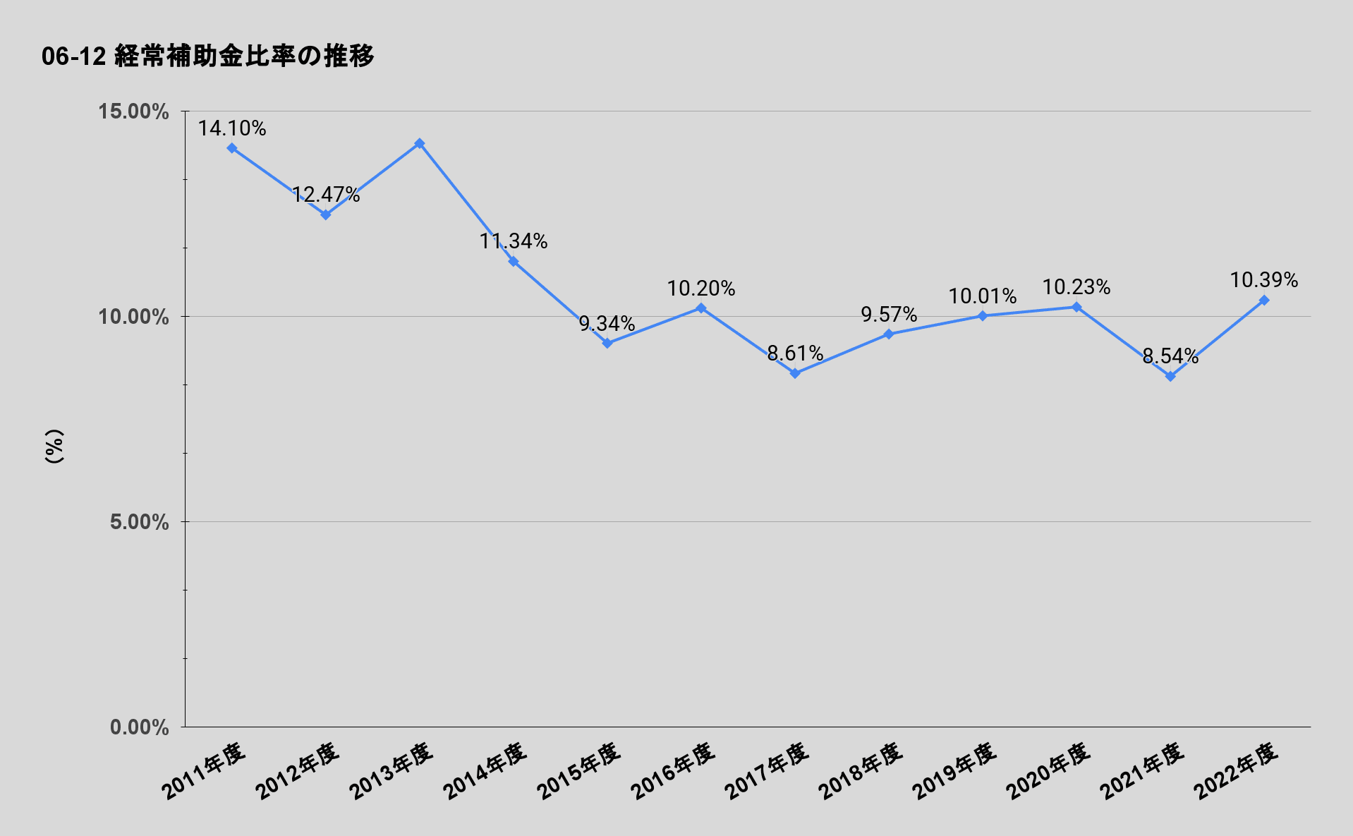 国又は地方公共団体の補助金の事業活動収入に占める割合である。 学校法人において、補助金は一般的に学生生徒等納付金に次ぐ第二の収入源泉であり、今や必要不可欠なものである。私立学校が公教育の一翼を担う観点からも今後の補 助金額の増加が大いに期待されている。 しかしこの比率が高い場合、学校法人独自の自主財源が相対的に小さく、国や地方公共 団体の補助金政策の動向に影響を受けやすいこととなるため、場合によっては学校経 営の柔軟性が損なわれる可能性も否定できない。