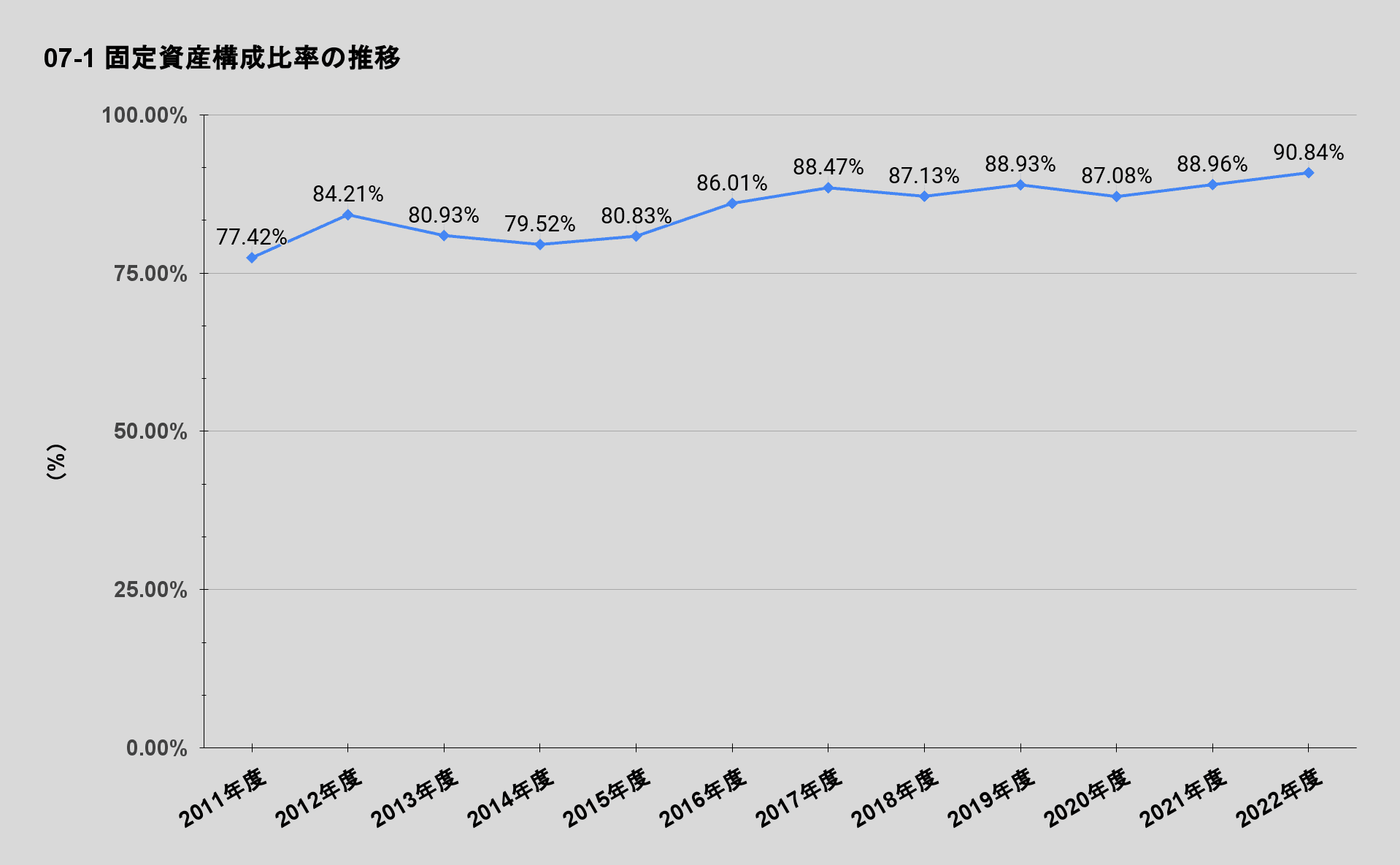 固定資産の総資産に占める構成割合で、流動資産構成比率とともに資産構成のバラン スを全体的に見るための指標である。 固定資産は施設設備等の有形固定資産と各種引当特定資産を内容とする特定資産を中心に構成されている。学校法人が行う教育研究事業には多額の設備投資が必要とな るため、一般的にはこの比率が高くなることが学校法人の財務的な特徴である。 この比率が学校法人全体の平均に比して特に高い場合、資産の固定化が進み流動性が 乏しくなっていると評価することができる。 しかし固定資産に占める特定資産の比率が高い学校法人においては必ずしもこの評価 は適切ではないため、資産の固定化を測る比率として、有形固定資産に焦点をあてた 「有形固定資産構成比率」を利用することも有効である。 なお、固定資産構成比率は、流動資産構成比率と表裏をなす関係にある。