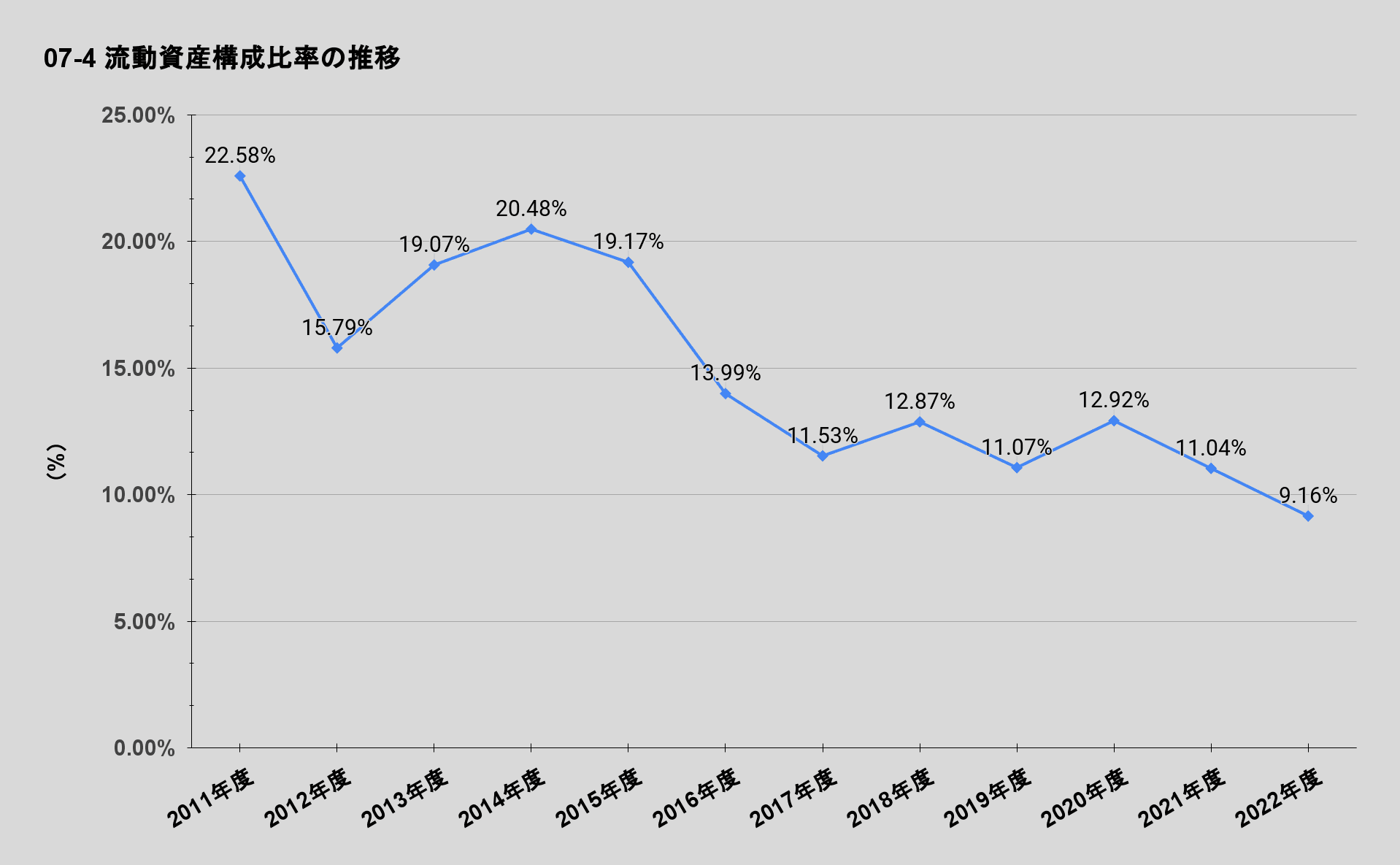 流動資産の総資産に占める構成割合で、固定資産構成比率とともに資産構成のバランスを全体的に見るための指標となる。 流動資産は現金預金と短期有価証券のほか、未収入金などで構成されている。 一般的にこの比率が高い場合、現金化が可能な資産の割合が大きく、資金流動性に富んでいると評価できる。 逆に著しく低い場合は、資金流動性に欠け、資金繰りが苦しい状況にあると評価できる。 この比率が低い場合であっても、低金利下での有利な運用条件を求めて長期預金や長 期有価証券を保有している場合や、将来的な財政基盤の安定化のために金融資産を目 的化して特定資産化している場合には、必ずしも流動性に乏しいとはいえないため、特 定資産や固定資産の有価証券の保有状況も確認して評価を行う必要がある。 なお、流動資産構成比率は 固定資産構成比率と表裏をなす関係にある。