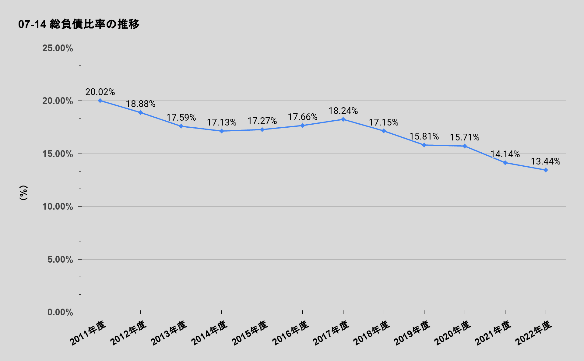 固定負債と流動負債を合計した負債総額の総資産に対する割合で、総資産に対する他人資金の比重を評価する極めて重要な比率である。 この比率は一般的に低いほど望ましく、50%を超えると負債総額が純資産を上回ることを示し、さらに100%を超えると負債総額が資産総額を上回る状態、いわゆる債務超過であることを示す。
