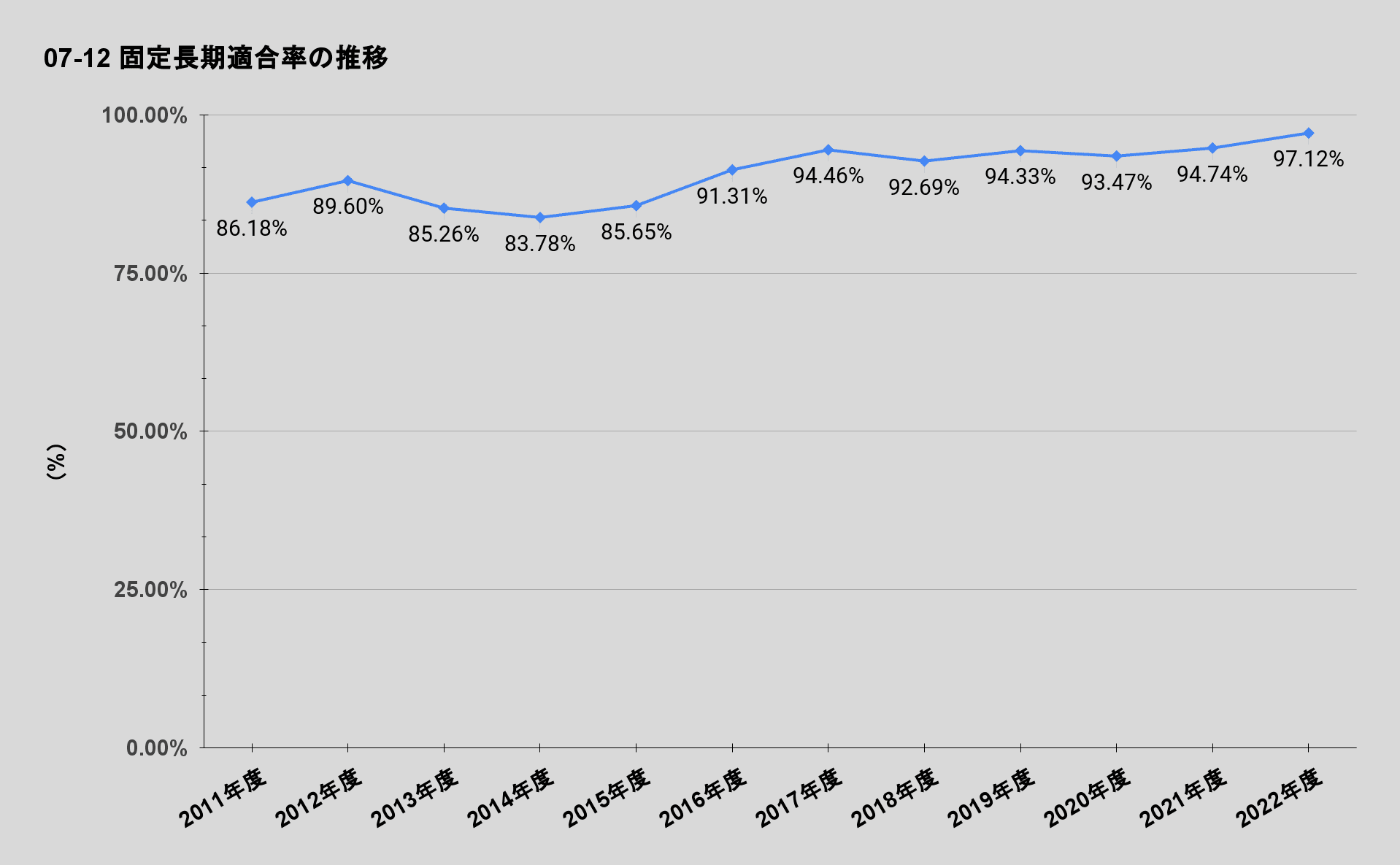 固定資産の、 純資産と固定負債の合計値である長期資金に対する割合で、固定比率を補完する役割を担う比率である。 固定資産の取得を行う場合、長期間活用できる安定した資金として自己資金のほか短期的に返済を迫られない長期借入金でこれを賄うべきであるという原則に対してどの程度適合しているかを示している。 この比率は100%以下で低いほど理想的とされる。 100%を超えた場合は、 固定資産の調達源泉に短期借入金等の流動負債を導入していると解することができ、 財政の安定性に欠け、 長期的にみて不安があることを示している。 固定比率が100%以上の法人にあっては、この固定長期適合率を併用するとともに固定資産の内容に注意して分析することが望ましい。
